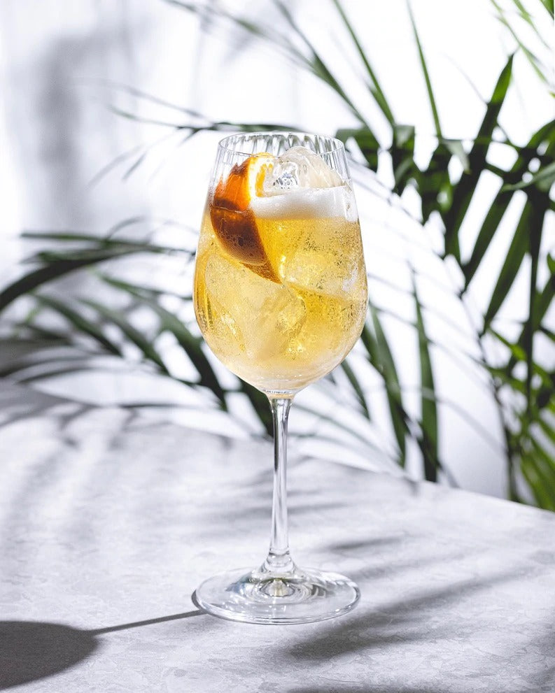 ワイングラスに入れた立方体氷または手で割った氷の上にすべての材料を注ぎ、軽くかき混ぜます。