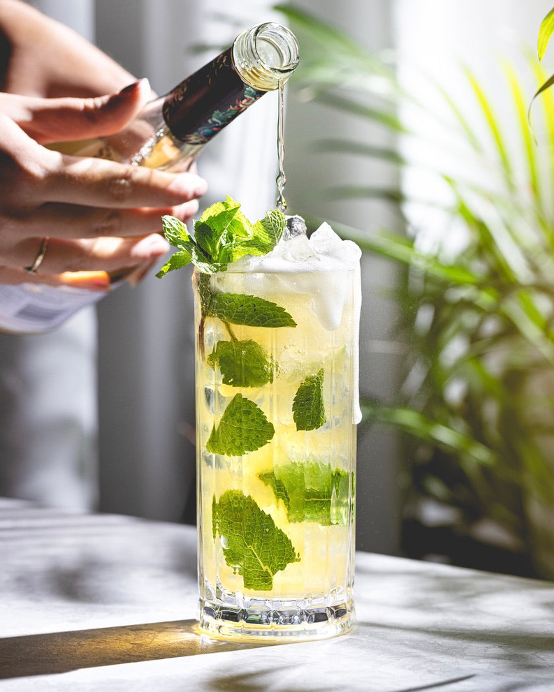 ハイボールのクラッシュアイスの上にすべての材料を入れ、泡立つまでスプーンでかき混ぜます。その上に砕いた氷の山を乗せ、さらに最澄ダージリンを加え、ミントの小枝を飾ります。