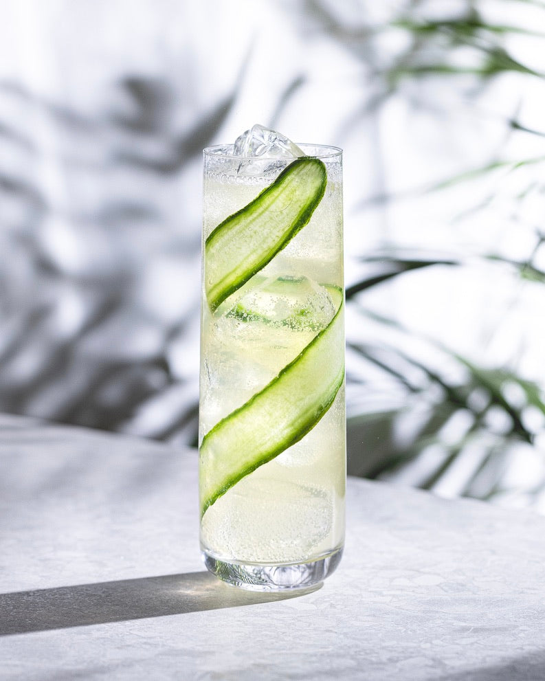 野菜の皮むき器を使って、キュウリを細長く切り、グラスの内側に螺旋状に垂らし、角氷を注ぎます。立方体氷を満たしたカクテルシェーカーに最澄ジャスミン以外のすべての材料を加え、シェイクし、準備しておいたグラスに細かく濾し、最澄ジャスミンをトッピングしてお召し上がりください。