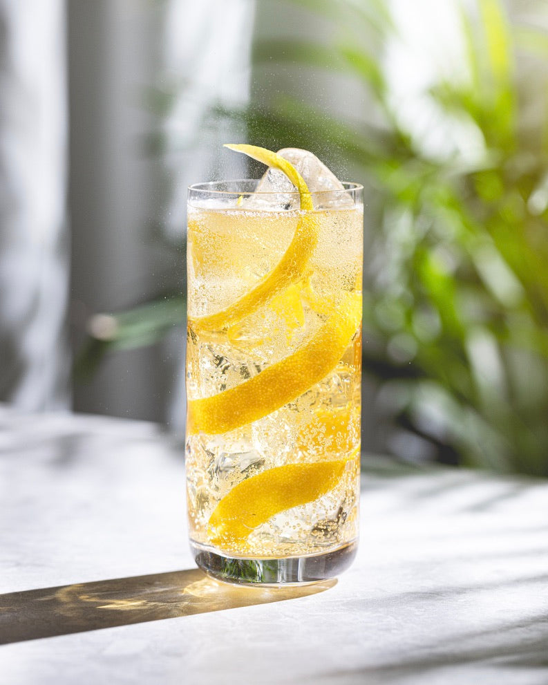 すべての材料を大きな氷槍またはハイボールグラスに入れた大きな氷の上に置き、軽くかき混ぜて混ぜ合わせます。野菜の皮むき器を使って、非常に長いレモンの皮を剥き、グラスの底から上まで氷の周りに巻き付けます。仕える。