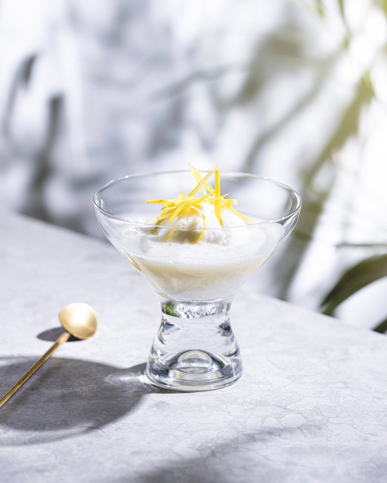 冷やしたシャンパンソーサーにレモンシャーベットをひとさじ入れ、最初にプロセッコ、次に彩朝ジャスミンを慎重に注ぎ、シャーベットの上にレモンの皮のコンフィを少し加え、スプーンで盛り付けます。